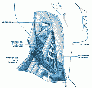 (A) lato destro del collo: arteria carotide comune (CC), con afflusso cerebrale (rosso), e la vena giugulare interna destra (IJVr), con deflusso cerebrale normale (blu).