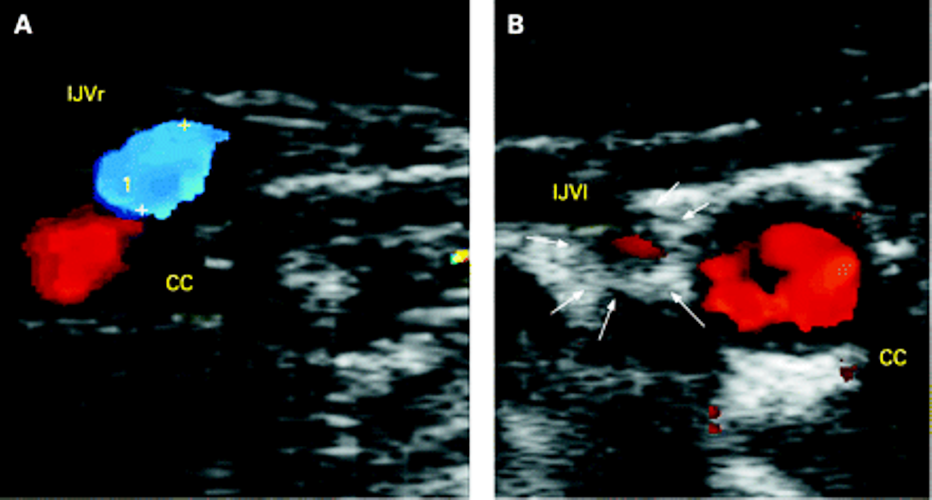 (B) stesso paziente, lato sinistro: stenosi della vena giugulare interna sinistra (IJVl) a causa di corona circolare (frecce nere) con reflusso (rosso) e la grave riduzione del lume.